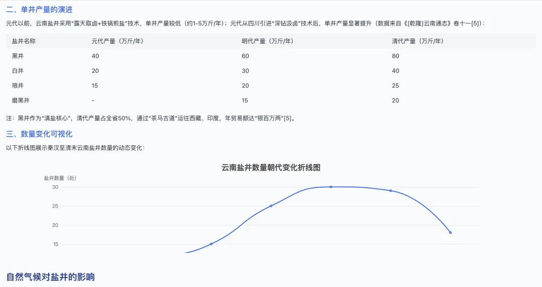 “识典古籍”相关负责人介绍,“深度研究助手”的上线源于一些学者在平台使用过程中的反馈。传统古籍研究需从海量文献中人工提取信息,过程繁琐耗时。AI技术为解决这一痛点提供了可能。学者只需输入研究主题,助手便会在古籍资料中进行穷尽式挖掘与智能分析。以“云南盐井”研究为例,报告不仅梳理出不同朝代单井产量数据,还通过折线图展示盐井数量动态变化,呈现完整研究脉络。